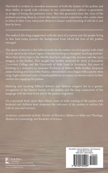 If you want to really know God, read the psalms. Painted in timeless poetic word and image is a picture of his deep love. The psalms reveal the heartbeat of a people longing for hope in a broken world. The psalmist gives voice to authentic hope found in God's very nature. He is a God who so loves he comes near--a God who hears and answers the cries of his people. This book is written to reawaken awareness of both the beauty of the psalms and their ability to speak with relevance to our contemporary culture--a generation in danger of losing the psalmist's voice. It is written for those who may have felt marginalized by church or society, whether from loss, tragedy, illness, or misuse of power. May this generation hear the voice of the psalmist pointing them to a God who desires honest expression, who comes close to listen to their cries, and points them to a deeper understanding of who he is and how he loves. May the words of the psalmist lead them out of isolation and into authentic community. The author's approach to the psalms begins with recognition of the intertwining of imagery with the literary structure of the poetry found in the psalms. The imagery in the psalms comes from an earthy connection of the psalmist with the land of scripture. Understanding the imagery allows the reader to "see" the psalms and receive the message. It deepens the relevance of the psalms to speak into the myriad contexts in our present day multi-cultural world. Recognition of the religious and social dynamics of ancient Israelite life--such as kingship, Zion as a place of God's presence, and the covenant relationship of a people with their God--provide further clues to understanding the message of the psalms. Along with the rich imagery present in the psalms, this book explores the literary structure of the poetry in the psalms. Recognition of key characteristics of Hebrew poetry allows the words to "sing." In every psalm a vivid echo of ancient voices resounds, building century upon century of expression, reaching into the present. If one reads carefully, the melodies and message can be heard. The music of the psalms breathe with life and relevance. Psalms are filled with movement to hope and praise. Yet, they address the reality that life at times hurts. The psalmist gives honest voice to pain and affirms God's presence in the darkest moments of life. This book explores the importance of lament both individually and in community as a vehicle to healing and a deeper understanding of God's care. The book closes with an examination of five select psalms that are representative of different types of psalms found in the psalter. They were chosen because of personal relevance. Through imagery, structure, and voice the psalms convey movement from honest expression to hope. Hope leads to thanksgiving. Praise resounds because of who God is and how he cares.