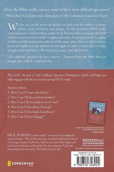 In this six-session small group Bible study (DVD/digital video sold separately), Rick Warren helps you find the simple, straightforward answers in ancient Scripture that lead to purpose, peace and joy... starting today. Drawing from the examples of bible characters who faced many of the same issues we face today - stress, failure, crisis, loneliness, and change - Warren offers concise, practical insights you can understand and apply in order to move past ordinary struggles to experience a life of extraordinary peace and significance. Life's difficult questions do have answers... answers from the Bible that can change your life. This Participant Guide features discovery questions, key verses, space for notes, guidelines for application, and much more. Sessions include: How Can I Cope with Stress? How Can I Rebound from Failure? How Can I Be Confident in Christ? How Can I Live above Average? How Can I Overcome Loneliness? How Can I Ever Change? Designed for use with the God's Answers to Life's Difficult Questions Video Study (sold separately).