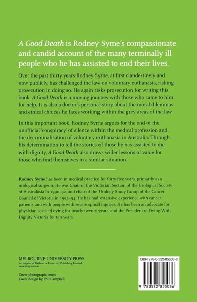 A Good Death is Rodney Syme's extraordinarily candid and controversial account of the many terminally ill people who he has assisted to end their lives. Over the last 30 years Syme, at first clandestinely and now publicly, has challenged the law on voluntary euthanasia, risking prosecution in doing so. He again risks prosecution for writing this book. ""A Good Death"" is a moving journey with those who came to Rodney Syme for help and a meditation on what it means to confront death in our culture. It is also a doctor's personal story about the moral dilemmas and ethical choices he faces working within the grey areas of the law.In ""A Good Death"" Rodney Syme argues for the end of the unofficial 'conspiracy' of silence within the medical profession and the decriminalisation of voluntary euthanasia in Australia. Through Syme's determination to tell the stories of those who he has assisted to die with dignity, ""A Good Death"" also draws wider lessons of value for those who find themselves in a similar situation.