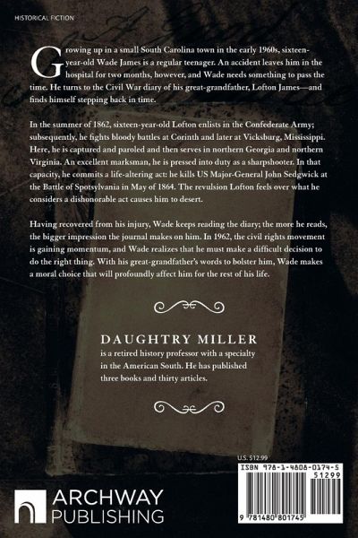 Growing up in a small South Carolina town in the early 1960s, sixteen-year-old Wade James is a regular teenager. An accident leaves him in the hospital for two months, however, and Wade needs something to pass the time. He turns to the Civil War diary of his great-grandfather, Lofton James-and finds himself stepping back in time. In the summer of 1862, sixteen-year-old Lofton enlists in the Confederate Army; subsequently, he fights bloody battles at Corinth and later at Vicksburg, Mississippi. Here, he is captured and paroled and then serves in northern Georgia and northern Virginia. An excellent marksman, he is pressed into duty as a sharpshooter. In that capacity, he commits a life-altering act: he kills US Major-General John Sedgwick at the Battle of Spotsylvania in May of 1864. The revulsion Lofton feels over what he considers a dishonorable act causes him to desert. Having recovered from his injury, Wade keeps reading the diary; the more he reads, the bigger impression the journal makes on him. In 1962, the civil rights movement is gaining momentum, and Wade realizes that he must make a difficult decision to do the right thing. With his great-grandfather's words to bolster him, Wade makes a moral choice that will profoundly affect him for the rest of his life.