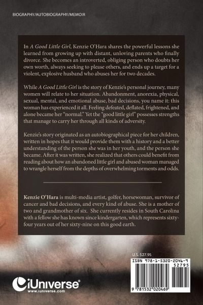 In A Good Little Girl, Kenzie O'Hara shares the powerful lessons she learned from growing up with distant, unloving parents who finally divorce. She becomes an introverted, obliging person who doubts her own worth, always seeking to please others, and ends up a target for a violent, explosive husband who abuses her for two decades. While A Good Little Girl is the story of Kenzie's personal journey, many women will relate to her situation. Abandonment, anorexia, physical, sexual,mental, and emotional abuse, bad decisions, you name it: this woman has experienced it all. Feeling defeated, deflated, frightened, and alone became her "normal." Yet the "good little girl" possesses strengths that manage to carry her through all kinds of adversity. Kenzie's story originated as an autobiographical piece for her children, written in hopes that it would provide them with a history and a better understanding of the person she was in her youth, and the person she became. After it was written, she realized that others could benefit from reading about how an abandoned little girl and abused woman managed to wrangle herself from the depths of overwhelming torments and odds.