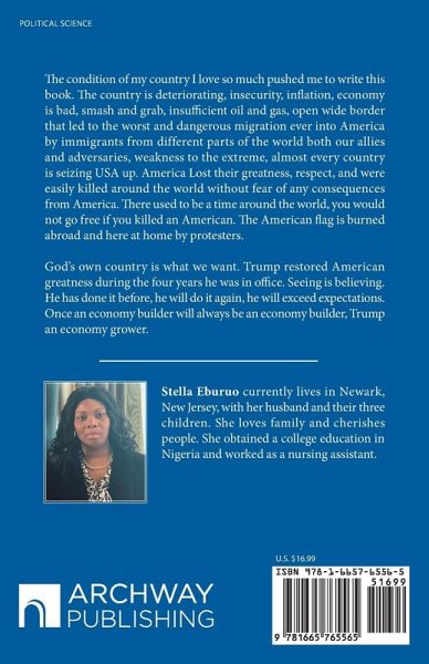 The condition of my country I love so much pushed me to write this book. The country is deteriorating, insecurity, inflation, economy is bad, smash and grab, insufficient oil and gas, open wide border that led to the worst and dangerous migration ever into America by immigrants from different parts of the world both our allies and adversaries, weakness to the extreme, almost every country is seizing USA up. America Lost their greatness, respect, and were easily killed around the world without fear of any consequences from America. There used to be a time around the world, you would not go free if you killed an American. The American flag is burned abroad and here at home by protesters. God's own country is what we want. Trump restored American greatness during the four years he was in office. Seeing is believing. He has done it before, he will do it again, he will exceed expectations. Once an economy builder will always be an economy builder, Trump an economy grower.