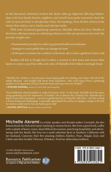 In this fast-paced, distracted modern life, hearts often go neglected, affecting relationships with God, family, friends, neighbors, and oneself. Jesus spoke extensively about the state of a person’s heart in discipleship to him. His teachings, from the first century to the twenty-first century, carry timeless and relevant truths. With years of practical gardening experience, Michelle delves into Jesus’ Parable of the Sower, offering wisdom on cultivating wholeness in life and openness to his word. She provides insights into: -Fundamental principles for achieving spiritual health and wholeness -Strategies to avoid pitfalls that can damage the heart -Techniques to monitor the condition of the heart, akin to how a gardener tends to soil Readers will feel as though they’ve taken a moment to slow down and nurture their hearts, to enjoy a cup of hot coffee and a slice of Michelle’s fresh-baked sourdough bread.