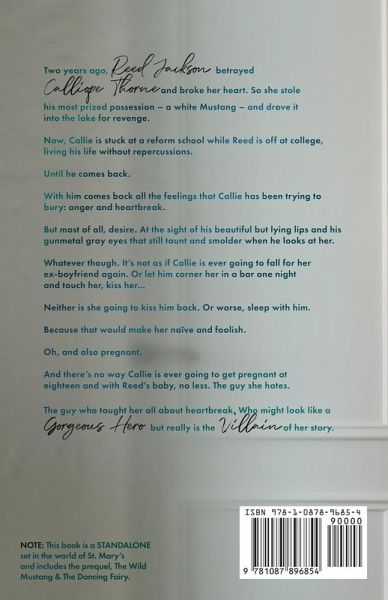 *A standalone novel set in the world of St. Mary's **INCLUDES the prequel, The Wild Mustang & The Dancing Fairy Two years ago, Reed Jackson betrayed Calliope Thorne and broke her heart. So she stole his most prized possession - a white mustang - and drove it into the lake for revenge. Now, Callie is stuck at a reform school while Reed is off at college, living his life without repercussions. Until he comes back. With him comes back all the feelings that Callie has been trying to bury: anger and heartbreak. But most of all, desire. At the sight of his beautiful but lying lips and his gunmetal gray eyes that still taunt and smolder when he looks at her. Whatever though. It's not as if Callie is ever going to fall for her ex-boyfriend again. Or let him corner her in a bar one night and touch her, kiss her... Neither is she going to kiss him back. Or worse, sleep with him. Because that would make her naïve and foolish. Oh, and also pregnant. And there's no way Callie is ever going to get pregnant at eighteen and with Reed's baby, no less. The guy she hates.The guy who taught her all about heartbreak. Who might look like a gorgeous hero but really is the villain of her story.