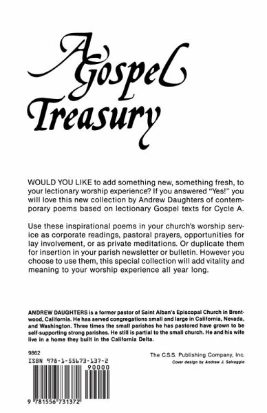 Would you like to add something new, something fresh, to your lectionary worship experience? If you answered "Yes!" you will love this new collection by Andrew Daughters of contemporary poems based on lectionary Gospel texts for Cycle A. Use these inspirational poems in your church's worship service as corporate readings, pastoral prayers, opportunities for lay involvement, or as private meditations. Or duplicate them for insertion in your parish newsletter or bulletin. However you choose to use them, this special collection will add vitality and meaning to your worship experience all year long. Andrew Daughters is a former pastor of Saint Alban's Episcopal Church in Brentwood, California. He has served congregations small and large in California, Nevada, and Washington. Three times the small parishes he has pastored have grown to be self-supporting strong parishes. He still is partial to the small church. He and his wife live in a home they built in the California Delta.