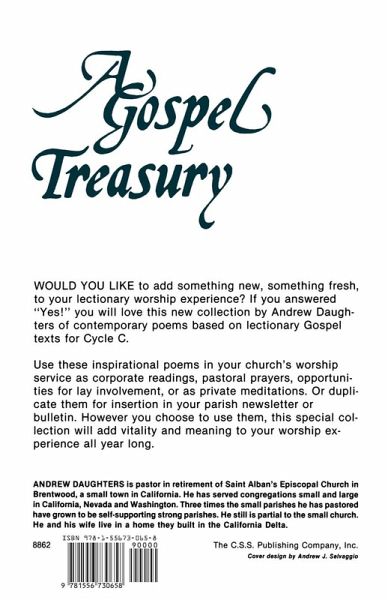 Would you like to add something new, something fresh, to your lectionary worship experience? If you answered "Yes!" you will love this new collection by Andrew Daughters of contemporary poems based on lectionary Gospel texts for Cycle C. Use these inspirational poems in your church's worship service as corporate readings, pastoral prayers, opportunities for lay involvement, or as private meditations. Or duplicate them for insertion in your parish newsletter or bulletin. However you choose to use them, this special collection will add vitality and meaning to your worship experience all year long. Andrew Daughters is pastor in retirement of Saint Alban's Episcopal Church in Brentwood, a small town in California. He has served congregations small and large in California, Nevada and Washington. Three times the small parishes he has pastored have grown to be self-supporting strong parishes. He still is partial to the small church. He and his wife live in a home they built in the California Delta.