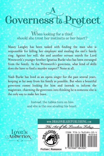 When looking for a thief, should she trust her instincts or her heart? Maxey Langley has been tasked with finding the man who is responsible for killing her employer and stealing the earl's family ring. Against her will, she and another servant search for Lord Wentworth's younger brother Ignatius Burke who has been estranged from the family. As the Wentworth's governess, what kind of skills does she have to find a murder suspect? None at all. Nash Burke has lived as an opera singer for the past several years, keeping as far away from his family as possible. But when a beautiful governess comes looking for him and intends to inform the magistrate, charming the governess into thinking he is someone else is the only way to make her leave. Instead, the tables turn on him and she is the one stealing his heart. Love's Addiction A Wallflower to Love A Governess to Protect A Maiden to Remember
