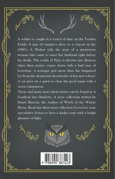 A soldier is caught in a vortex of time on the Verdun Fields. A pair of vampires drive to a concert in the 1980's. A Widow tells the story of a mysterious woman who came to meet her husband right before his death. The realm of Fairy is thrown into disarray when their prince comes down with a bad case of boredom. A teenager gets more than she bargained for from the dictatorial cheerleader of her new school. A cat goes on a quest to clear his good name with a raven companion. These and many more short stories can be found in A Gradient into Shadows. A story collection written by Stuart Mascair, the Author of Witch of the Winter Moon. Read this short story collection if you love your speculative fiction to have a darker tone with a bright glimmer of light.