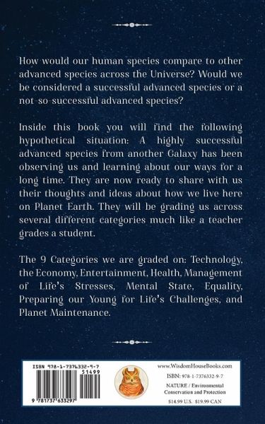 How would our human species compare to other advanced species across the Universe? Would we be considered a successful advanced species or a not-so-successful advanced species? Inside this book you will find the following hypothetical situation: A highly successful advanced species from another Galaxy has been observing us and learning about our ways for a long time. They are now ready to share with us their thoughts and ideas about how we live here on Planet Earth. They will be grading us across several different categories much like a teacher grades a student. The 9 Categories we are graded on: Technology, the Economy, Entertainment, Health, Management of Life's Stresses, Mental State, Equality, Preparing our Young for Life's Challenges, and Planet Maintenance. Are we a highly successful A/B type species or are we something less? The answer is revealed within these pages.