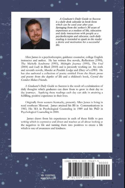 "A Graduate's Daily Guide to Success" is a daily desk calendar in book form which can be used year after year. Springing from the author's 30 years of experience as a high school English teacher, college English instructor, high school counselor and psychotherapist, each reading is intended to spark in the graduate a desire and motivation for success. Applying these readings to your day can aide in encouraging a life which is fulfilling and successful.