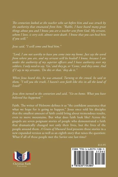 The centurion looked at the teacher who sat before him and was struck by the authority that emanated from him. "Rabbi, I have heard many great things about you and I know you are a teacher sent from God. My servant, whom I love, is very sick, almost unto death. I know that you can heal him if you will." Jesus said, "I will come and heal him." "Lord, I am not worthy to have you come into my home. Just say the word from where you are, and my servant will be healed! I know, because I am under the authority of my superior officers and I have authority over my soldiers. I only need to say, ‘Go,’ and they go, or ‘Come,’ and they come. And if I say to my servants, ‘Do this or that,’ they do it." When Jesus heard this, he was amazed. Turning to the crowd, he said to them, "I tell you the truth, I haven’t seen faith like this in all the land of Israel!" Jesus then turned to the centurion and said, "Go on home. What you have believed has happened." Faith. The writer of Hebrews defines it as "the confident assurance that what we hope for is going to happen." Jesus once told his disciples that the smallest amount of faith could bring about tremendous results, even to move mountains. But what does faith look like? Across the gospels are seven poignant stories of people who demonstrated a faith that dramatically changed not only their lives, but the lives of the people around them. A Grain of Mustard Seed presents these stories in a new expanded version as well as an eighth story that raises the question: What if all of these people met the Savior one last time?