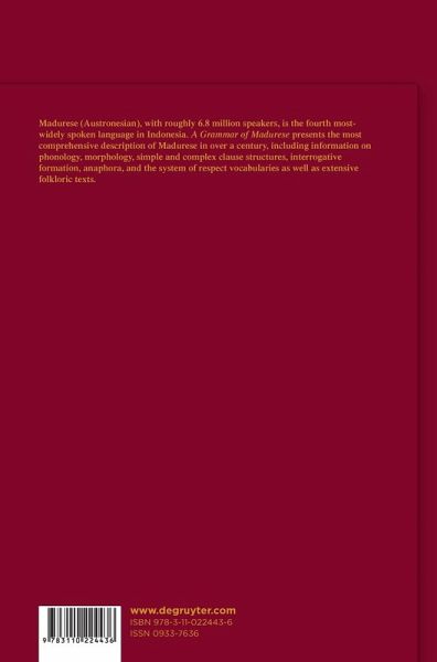 Madurese is a major regional language of Indonesia, with some 14 million speakers, mainly on the island of Madura and adjacent parts of Java, making it the fourth largest language of Indonesia after Indonesian, Javanese, and Sundanese. There is no existing comprehensive descriptive grammar of the language, with existing studies being either sketches of the whole grammar, or detailed descriptions of phonology and morphology or some particular topics within these components of the grammar. There is no competing work that provides the breadth and depth of coverage of this grammar, in particular (though not exclusively) with regard to syntax.