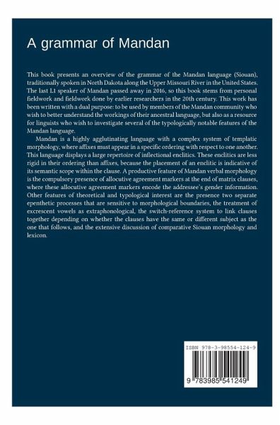Mandan is a Siouan language of North Dakota, near the geographic center of North America. There are no longer any first-language speakers after the last fluent speaker passed away in 2016. This grammar has been built from archival recordings of Mandan speakers from the 1960s through 2010, plus field work by the author undertaken between 2014 and 2016. The data from these various sources allowed for an in-depth description of the key aspects of the grammar of Mandan with special attention to the language's complex verbal and nominal morphology. This book also includes an overview of Mandan narrative structure, culminating with an interlinear gloss of a traditional Mandan narrative and its free translation into English. This grammar is written to be used by as general an audience as possible, including Mandan community members, scholars who wish to research Siouan languages, linguistic typologists, historical linguists, and other individuals who aim to conduct research on an indigenous language of North America.