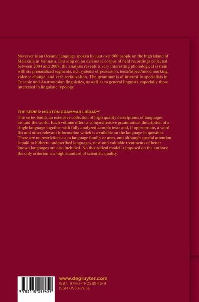 Neverver is an Oceanic language spoken by just over 500 people on the high island of Malekula in Vanuatu. Drawing on an extensive corpus of field recordings collected between 2004 and 2008, the analysis reveals a very interesting phonological system with six prenasalized segments, rich systems of possession, tense/aspect/mood marking, valence change, and verb serialization. The grammar is of interest to specialists in Oceanic and Austronesian linguistics, as well as to general linguists, especially those interested in linguistic typology.