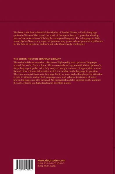 The book is the first substantial description of Tundra Nenets, a highly endangered Uralic language spoken in Western Siberia and the north of European Russia, destined for the international linguistic community. Its purpose is to provide a thorough documentation of all of the major grammatical phenomena in the language. The grammar particularly emphasizes the description of syntax, because this has traditionally been a very neglected area of Nenets studies. Many syntactic aspects have not received a systematic treatment in the existing literature or have not been addressed at all. Since the existing works are not easily available, incomplete, or idiosyncratically presented, Tundra Nenets syntax has played little or no role in the considerations of modern linguists, whether more descriptively or theoretically inclined. The book is largely descriptive: it is not intended to address theoretical questions per se and the description is not meant to be formulated within a particular framework. However, it identifies and discusses issues which are of broad typological and theoretical interest. The description is richly exemplified. Most of the cited examples are the result of fieldwork conducted by the in various locations. They are sentences produced by native speakers either spontaneously or elicited in response to questions posed in Russian. Other examples are excerpts from original texts.