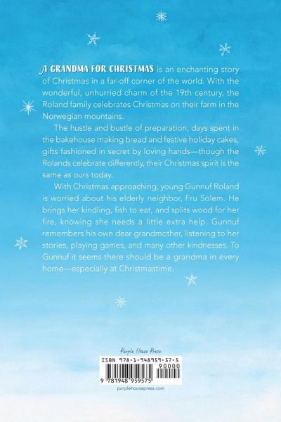 75th Anniversary Edition. Printed in full color. A Grandma for Christmas is an enchanting story of Christmas in a far-off corner of the world. With the wonderful, unhurried charm of the 19th century, the Roland family celebrates Christmas on their farm in the Norwegian mountains. The hustle and bustle of preparation, days spent in the bakehouse making bread and festive holiday cakes, gifts fashioned in secret by loving hands-though the Rolands celebrate differently, their Christmas spirit is the same as ours today. With Christmas approaching, young Gunnuf Roland is worried about his elderly neighbor, Fru Solem. He brings her kindling, fish to eat, and splits wood for her fire, knowing she needs a little extra help. He remembers his own dear grandmother, listening to her stories, playing games, and many other kindnesses. To Gunnuf it seems there should be a grandma in every home-especially at Christmastime. A glossary of Norwegian terms and seven authentic Norwegian recipes are included. All black and white illustrations have been partly colorized in blue, red and yellow to blend with the original style.