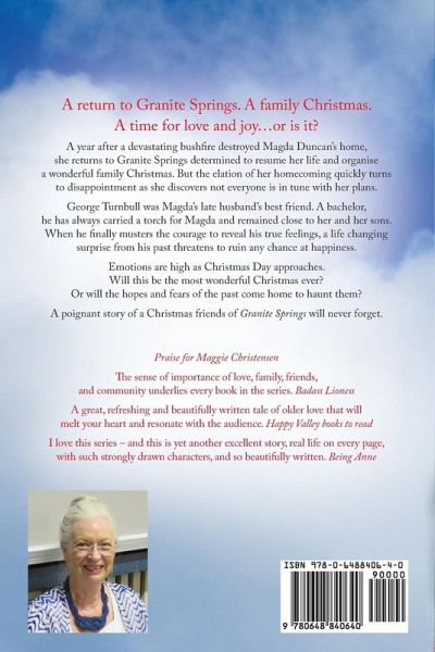 A return to Granite Springs. A family Christmas. A time for love and joy...or is it? A year after a devastating bushfire destroyed Magda Duncan's home, she returns to Granite Springs determined to resume her life and organise a wonderful family Christmas. But the elation of her homecoming quickly turns to disappointment as she discovers not everyone is in tune with her plans. George Turnbull was Magda's late husband's best friend. A bachelor, he has always carried a torch for Magda and remained close to her and her sons. When he finally musters the courage to reveal his true feelings, a life changing surprise from his past threatens to ruin any chance at happiness. Emotions are high as Christmas Day approaches. Will this be the most wonderful Christmas ever? Or will the hopes and fears of the past come home to haunt them? A poignant story of a Christmas friends of Granite Springs will never forget.