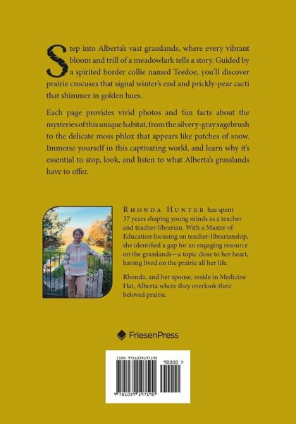 Step into Alberta's vast grasslands, where every vibrant bloom and trill of a meadowlark tells a story. Guided by a spirited border collie named Teedoe, you'll discover prairie crocuses that signal winter's end and prickly-pear cacti that shimmer in golden hues. Each page provides vivid photos and fun facts about the mysteries of this unique habitat, from the silvery-gray sagebrush to the delicate moss phlox that appears like patches of snow. Immerse yourself in this captivating world, and learn why it's essential to stop, look, and listen to what Alberta's grasslands have to offer.