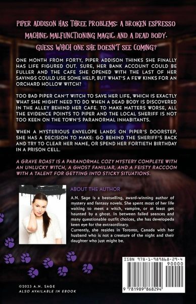 Piper Addison has three problems: a broken espresso machine, malfunctioning magic, and a dead body. Guess which one she doesn't see coming? One month from forty, Piper Addison thinks she finally has life figured out. Sure, her bank account could be fuller and the cafe she opened with the last of her savings could use some help, but what's a few kinks for an Orchard Hollow witch? Too bad Piper can't witch to save her life, which is exactly what she might need to do when a dead body is discovered in the alley behind her cafe. To make matters worse, all the evidence points to Piper and the local sheriff is not too keen on the town's paranormal inhabitants. When a mysterious envelope lands on Piper's doorstep, she has a decision to make: go behind the sheriff's back and try to clear her name, or spend her fortieth birthday in a prison cell. A Grave Roast is a paranormal cozy mystery complete with an unlucky witch, a ghost familiar, and a feisty raccoon with a talent for getting into sticky situations.