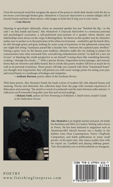 Alec Montalvo's debut echos between brutalism and the ethereal. A call to magic realism, set in New York City, these poems provide a haven for detached personas. The speakers squeeze themselves through the cracks of realism and emerge transformed as something fantastical. The collection opens with Three of Swords, the remains of an abandoned backyard wedding reduced to rubble, and then revitalized as a mystic ceremony. The title poem captures the experience of being dissociated at a house party and left in the throes of cabalism. A Grayscale Martyrdom is a collection of poems about gritty transformation, the effects of detachment and displacement along with the double function to reconstruct what was once internally dead into something holistically living.