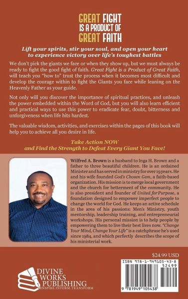 Lift your spirits, stir your soul, and open your heart to experience victory over life's toughest battles We don't pick the giants we face or when they show up, but we must always be ready to fight the good fight of faith. Great Fight is a Product of Great Faith, will teach you "how to" trust the process when it becomes most difficult and develop the courage within to fight the Giants you face while leaning on the Heavenly Father as your guide. Not only will you discover the importance of spiritual practices, and unleash the power embedded within the Word of God, but you will also learn efficient and practical ways to use this power to eradicate fear, doubt, bitterness and unforgiveness when life hits hardest. The valuable wisdom, activities, and exercises within the pages of this book will help you to achieve all you desire in life. Take Action NOW and Find the Strength Defeat Every Giant You Face!