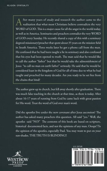 After many years of study and research the author came to the realization that what most Christians believe contradicts the very WORD of GOD. This is a major cause for all the angst in the world today, as well as in America. Seminaries and preachers contradict the very WORD of GOD every Sunday. He recently shared a copy of this with a seminary degreed missionary/preacher that spent about 35 years on the mission field in South America. Three weeks later he got a phone call from the man. He confessed that he had been taught a lie in seminary and also confessed that his eyes had been opened to truth. The man said that he would like to call the author "father" but that he would take the admonishment of Jesus "to call no man on earth father" seriously. He said that he would be considered least in the kingdom of God for all of time due to what he had taught and preached for many decades. Are you ready to be set free from the chains that bind?