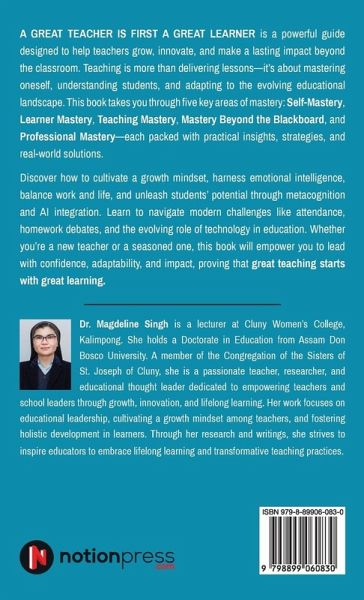 A GREAT TEACHER IS FIRST A GREAT LEARNER is a powerful guide designed to help teachers grow, innovate, and make a lasting impact beyond the classroom. Teaching is more than delivering lessons-it's about mastering oneself, understanding students, and adapting to the evolving educational landscape. This book takes you through five key areas of mastery: Self-Mastery, Learner Mastery, Teaching Mastery, Mastery Beyond the Blackboard, and Professional Mastery-each packed with practical insights, strategies, and real-world solutions. Discover how to cultivate a growth mindset, harness emotional intelligence, balance work and life, and unleash students' potential through metacognition and AI integration. Learn to navigate modern challenges like attendance, homework debates, and the evolving role of technology in education. Whether you're a new teacher or a seasoned one, this book will empower you to lead with confidence, adaptability, and impact, proving that great teaching starts with great learning.