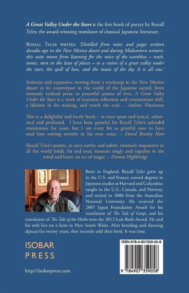 A Great Valley Under the Stars is the first book of poetry by Royall Tyler, the award-winning translator of The Tale of Genji, The Tale of the Heike, and other works of Japanese literature. Royall Tyler writes: "Distilled from notes and pages written decades ago in the New Mexico desert and during Midwestern winters, this suite moves from listening for the voice of the worthless - trash, stones, men in the least of places - to a vision of a great valley under the stars, the spell of love, and the music of the sky. It is all one." "Intimate and expansive, moving from a truckstop in the New Mexico desert to its counterpart in the world of the Japanese sacred, from intensely realised prose to prayerful poems of love, A Great Valley Under the Stars is a work of maturest reflection and consummate skill, a lifetime in the making, and worth the wait." (Andrew Fitzsimons) "This is a delightful and lovely book - at once spare and lyrical, whimsical and profound. I have been grateful for Royall Tyler's splendid translations for years, but I am every bit as grateful now to have read him writing entirely in his own voice." (David Bentley Hart) "Royall Tyler's poems, at once earthy and subtle, intensely responsive to all the world holds, far and near, resonate singly and together in the mind and heart: an act of magic." (Dianne Highbridge)