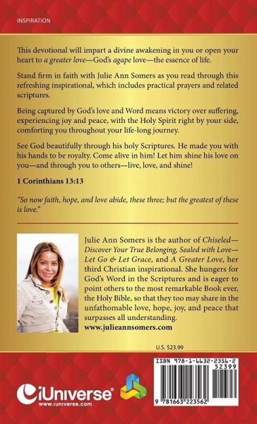 This devotional will impart a divine awakening in you or open your heart to a greater love-God's agape love-the essence of life. Stand firm in faith with Julie Ann Somers as you read through this uplifting inspirational, which includes practical prayers and related scriptures. Being captured by God's love and Word means victory over suffering, experiencing joy and peace, with the Holy Spirit right by your side, comforting you throughout your life-long journey. See God beautifully through his Word. He made you with his hands to be royalty. Come alive in him! Let him shine his love on you-and through you to others-live, love, and shine! 1 Corinthians 13:13 "So now faith, hope, and love abide, these three; but the greatest of these is love."
