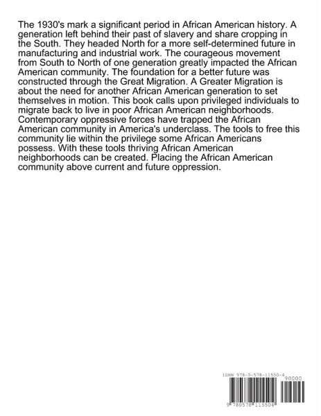 The 1930's mark a significant period in African American history. A generation left behind their past of slavery and share cropping in the South. They headed North for a more self-determined future in manufacturing and industrial work. The courageous movement from South to North of one generation greatly impacted the African American community. The foundation for a better future was constructed through the Great Migration. A Greater Migration is about the need for another African American generation to set themselves in motion. This book calls upon privileged individuals to migrate back to live in poor African American neighborhoods. Contemporary oppressive forces have trapped the African American community in America's underclass. The tools to free this community lie within the privilege some African Americans possess. With these tools thriving African American neighborhoods can be created. Placing the African American community above current and future oppression.