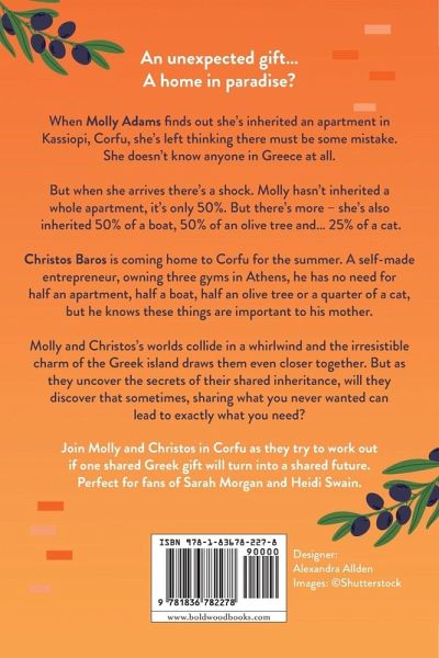 Escape to the sunshine with the queen of Greek romance, Mandy Baggot! An unexpected gift... A home in paradise? When Molly Adams finds out she's inherited an apartment in Kassiopi, Corfu, she's left thinking there must be some mistake. She doesn't know anyone in Greece at all. But when she arrives there's a shock. Molly hasn't inherited a whole apartment, it's only 50%. But there's more - she's also inherited 50% of a boat, 50% of an olive tree and... 25% of a cat. Christos Baros is coming home to Corfu for the summer. A self-made entrepreneur, owning three gyms in Athens, he has no need for half an apartment, half a boat, half an olive tree or a quarter of a cat, but he knows these things are important to his mother. Molly and Christos's worlds collide in a whirlwind and the irresistible charm of the Greek island draws them even closer together. But as they uncover the secrets of their shared inheritance, will they discover that sometimes, sharing what you never wanted can lead to exactly what you need? This summer, join Molly and Christos in Corfu as they try to work out if one shared Greek gift will turn into a shared future. Perfect for fans of Sue Moorcroft and Jenny Colgan. Praise for Mandy Baggot: 'The slow-burn romance between Eve and Gianni was perfect, and the Greek cast, particularly, adorable. A gorgeous summer read with all the ingredients I like best.' Sue Moorcroft 'Mandy Baggot at her best - equal measures heart, humour and romance. A must read.' Sandy Barker 'Mandy Baggot is the queen of sexy, fun, Greek-set stories.' Isabelle Broom 'A delightful escapist romance packed with sunshine, second chances and an utterly charming cast of characters.' Nina Kaye 'I loved the quirky local characters and even quirkier animals at the sanctuary. It was fun and romantic and a wonderful trip to Corfu!' Leonie Mack 'A sizzling summer read full of romance, drama and Greek sun! ... Mandy Baggot just gets better and better!' Katie Ginger 'Full of Mandy's trademark humour, wonderfully drawn characters and sizzling romance, there is also a deeper emotional level to this book. I loved every word of it.' Sue Fortin