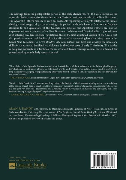 The writings from the postapostolic period of the early church (ca. 70-150 CE), known as the Apostolic Fathers, comprise the earliest extant Christian writings outside of the New Testament. The Apostolic Fathers furnish us with an invaluable repository of insights related to the issues, theology, and exegetical practices during this period in church history. Due to the frequent allusions to and quotations of the Gospels and Epistles, the Apostolic Fathers are also an important witness to the text of the New Testament. While several Greek-English diglot editions exist offering excellent English translations, this is the first annotated version of the Greek text that provides a contextual English gloss for all vocabulary occurring less than thirty times in the Greek New Testament. A Greek Reader's Apostolic Fathers will help one develop the necessary skills for an advanced familiarity and fluency in the Greek texts of early Christianity. This reader is designed primarily as a textbook for an advanced Greek readings course, but is intended for general reading or scholarly research as well.