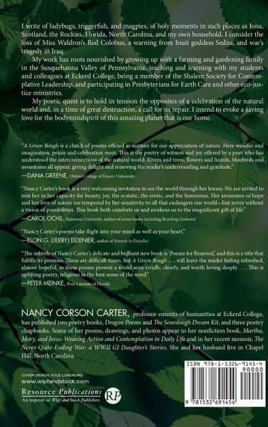 Nancy Corson Carter, professor emerita of humanities at Eckerd College, has published two poetry books, Dragon Poems and The Sourdough Dream Kit, and three poetry chapbooks. Some of her poems, drawings, and photos appear in her nonfiction book, Martha, Mary, and Jesus: Weaving Action and Contemplation in Daily Life and in her recent memoir, The Never-Quite-Ending War: a WWII GI Daughter's Stories. She and her husband live in Chapel Hill, North Carolina.