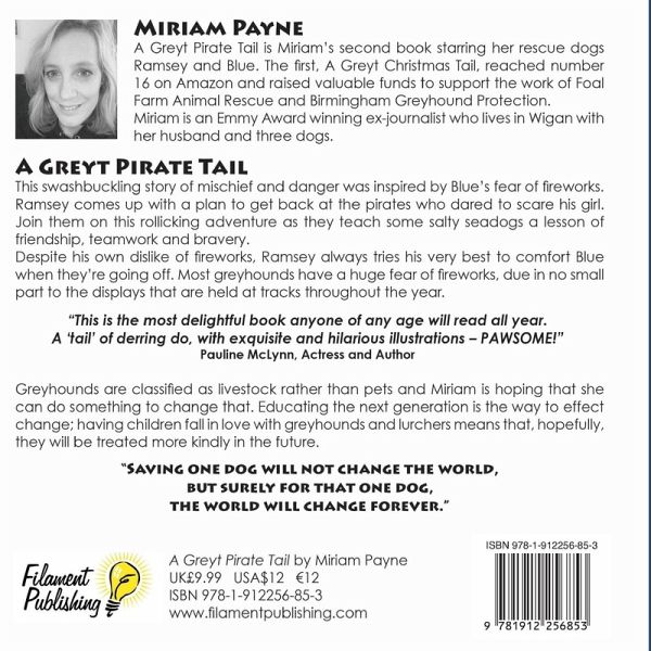 This swashbuckling story of mischief and danger was inspired by Blue's fear of fireworks. Ramsey comes up with a plan to get back at the pirates who dared to scare his girl. Join them on this rollicking adventure as they teach some salty seadogs a lesson of friendship, teamwork and bravery. Despite his own dislike of fireworks, Ramsey always tries his very best to comfort Blue when they're going off. Most greyhounds have a huge fear of fireworks, due in no small part to the displays that are held at tracks throughout the year. Greyhounds are classified as livestock rather than pets and Miriam is hoping that she can do something to change that. Educating the next generation is the way to effect change; having children fall in love with greyhounds and lurchers means that, hopefully, they will be treated more kindly in the future.
