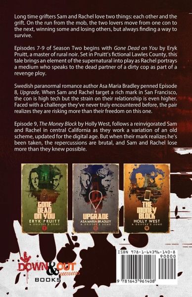 Long time grifters Sam and Rachel love two things: each other and the grift. On the run from the mob, the two lovers move from one con to the next, winning some and losing others, but always finding a way to survive. Episodes 7-9 of Season Two begins with Gone Dead on You by Eryk Pruitt, a master of rural noir. Set in Pruitt's fictional Lawles County, this tale brings an element of the supernatural into play as Rachel portrays a medium who speaks to the dead partner of a dirty cop as part of a revenge ploy. Swedish paranormal romance author Asa Maria Bradley penned Episode 8, Upgrade. When Sam and Rachel target a rich mark in San Francisco, the con is high tech but the strain on their relationship is even higher. Faced with a challenge they've never truly encountered before, the pair realizes they are risking more than their freedom on this one. Episode 9, The Money Block by Holly West, follows a reinvigorated Sam and Rachel in central California as they work a variation of an old scheme, updated for the digital age. But when their mark realizes he's been taken, the repercussions are brutal, and Sam and Rachel lose more than they knew possible.