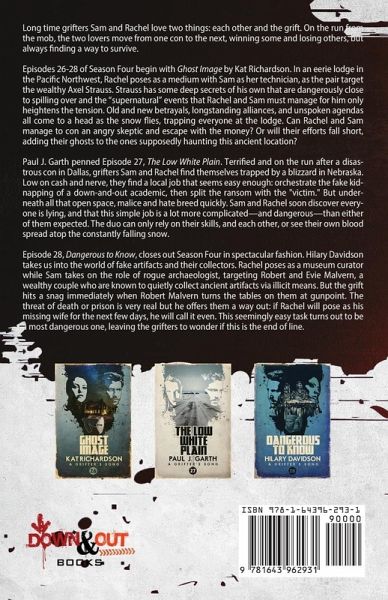 Long time grifters Sam and Rachel love two things: each other and the grift. On the run from the mob, the two lovers move from one con to the next, winning some and losing others, but always finding a way to survive. Episodes 26-28 of Season Four begin with Ghost Image by Kat Richardson. In an eerie lodge in the Pacific Northwest, Rachel poses as a medium with Sam as her technician, as the pair target the wealthy Axel Strauss. Strauss has some deep secrets of his own that are dangerously close to spilling over and the "supernatural" events that Rachel and Sam must manage for him only heightens the tension. Old and new betrayals, longstanding alliances, and unspoken agendas all come to a head as the snow flies, trapping everyone at the lodge. Can Rachel and Sam manage to con an angry skeptic and escape with the money? Or will their efforts fall short, adding their ghosts to the ones supposedly haunting this ancient location? Paul J. Garth penned Episode 27, The Low White Plain. Terrified and on the run after a disastrous con in Dallas, grifters Sam and Rachel find themselves trapped by a blizzard in Nebraska. Low on cash and nerve, they find a local job that seems easy enough: orchestrate the fake kidnapping of a down-and-out academic, then split the ransom with the "victim." But underneath all that open space, malice and hate breed quickly. Sam and Rachel soon discover everyone is lying, and that this simple job is a lot more complicated-and dangerous-than either of them expected. The duo can only rely on their skills, and each other, or see their own blood spread atop the constantly falling snow. Episode 28, Dangerous to Know, closes out Season Four in spectacular fashion. Hilary Davidson takes us into the world of fake artifacts and their collectors. Rachel poses as a museum curator while Sam takes on the role of rogue archaeologist, targeting Robert and Evie Malvern, a wealthy couple who are known to quietly collect ancient artifacts via illicit means. But the grift hits a snag immediately when Robert Malvern turns the tables on them at gunpoint. The threat of death or prison is very real but he offers them a way out: if Rachel will pose as his missing wife for the next few days, he will call it even. This seemingly easy task turns out to be a most dangerous one, leaving the grifters to wonder if this is the end of line.