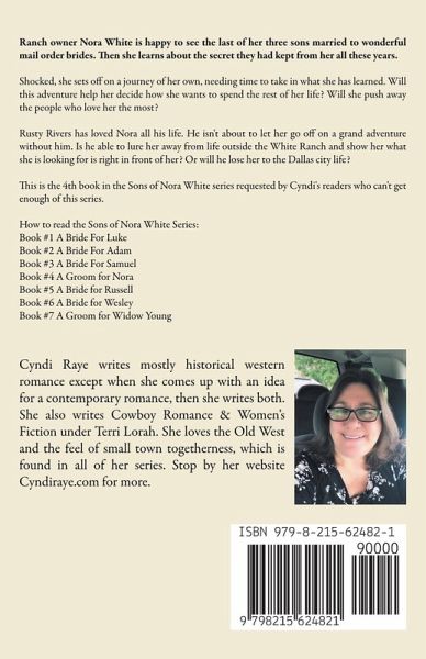 Ranch owner Nora White is happy to see the last of her three sons married to wonderful mail order brides. Then she learns about the secret they had kept from her all these years. Shocked, she sets off on a journey of her own, needing time to take in what she has learned. Will this adventure help her decide how she wants to spend the rest of her life? Will she push away the people who love her the most? Rusty Rivers has loved Nora all his life. He isn't about to let her go off on a grand adventure without him. Is he able to lure her away from life outside the White Ranch and show her what she is looking for is right in front of her? Or will he lose her to the Dallas city life? This is the 4th book in the Sons of Nora White series requested by Cyndi's readers who can't get enough of this series. How to read the Sons of Nora White Series: Book #1 A Bride For Luke Book #2 A Bride For Adam Book #3 A Bride For Samuel Book #4 A Groom for Nora Book #5 A Bride for Russell Book #6 A Bride for Wesley Book #7 A Groom for Widow Young