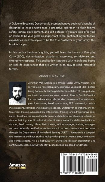 A Guide to Becoming Dangerous is a comprehensive beginner's handbook designed to help anyone take a proactive approach to their famiy's safety, tactical development, and self-defense. If you are tired of relying on others to be your guardian angel, want to feel confident in your tactical capabilities, or even aspire to be the true protector of your family, this book is for you. In this tactical beginner's guide, you will learn the basics of Everyday Carry (EDC), risk mitigation, situational awareness, self-defense, and emergency response. This publication is packed with knowledge based on real-life experiences that are written in an easy-to-read instructive format.