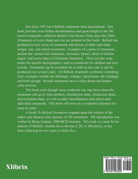 Not since 1993 have Belleek ornaments been documented. This book provides even further documentation and great insight to the 186 known ornaments crafted by Belleek Fine Parian China since the 1980¿s. Ornaments of every shape and size are pictured in this book. Belleek has produced several series of ornaments and dozens of other individual, unique, rare, and retired ornaments. Example of a series of ornaments include the: annual bell ornaments, snowmen, santäs, doors of Dublin, angels, and twelve days of Christmas ornaments. There are also ornaments for specific demographics, such as ornaments for children and newlyweds. Ornaments can be around for as little as one year or can be produced over several years. All Belleek ornaments symbolize something Irish, examples include the shillelagh, cottages, leprechauns, the claddagh, and Irish sayings. Several ornaments have a celtic theme and feature celtic artwork. This book sorts through some confusion one may have about the ornaments and gives item numbers, introduction dates, production dates, and retirement dates, as well as other miscellaneous facts about each individual ornament. This book will serve as a wonderful reference for years to come. This book expands upon the website of the author and features color pictures of 103 ornaments. The Introduction was written by Brian Graham, 2000 BCIS honoree. This book is a must for an admirer of Belleek, whether he or she has 2, 20, or 200 pieces, or has been collecting for two years or thirty-five.