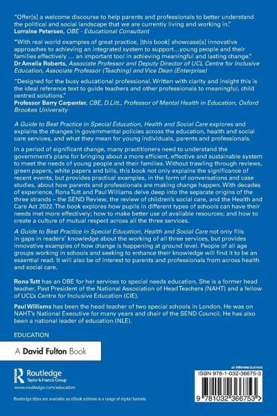 In a period of significant change, many practitioners need to understand the government's plans for bringing about a more efficient, effective and sustainable system to meet the needs of young people and their families. Without trawling through reviews, green papers, white papers and bills, this book not only explains the significance of recent events, but provides practical examples, in the form of conversations and case studies, about how parents and professionals are making change happen. With decades of experience, Rona Tutt and Paul Williams delve deep into the separate origins of the three strands - the SEND Review, the review of children's social care, and the Health and Care Act 2022. The book explores how pupilsin different types of schools can have their needs met more effectively; how to make better use of available resources; and how to create a culture of mutual respect across all the three services.