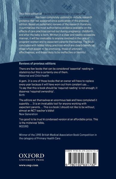 A Guide to Effective Care in Pregnancy and Childbirth is a clearly written review of the important research evidence on the effects of the various care practices carried out during pregnancy, childbirth, and the early days after birth. In addition to the details provided in the text, the book concludes with valuable tables that list the practices which are beneficial, those of unknown effectiveness, and those likely to be ineffective or harmful.