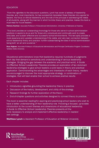 Educational administrators know that leadership requires hundreds of judgments each day that require a sensitivity and understanding of various leadership strategies. Bridging the gap between the academic and practical world, A Guide to Effective School Leadership Theories provides an exploration of ten dominant leadership strategies to give school leaders a solid basis in theory and practical application. Demonstrating the advantages and drawbacks of each theory, readers are encouraged to discover the most appropriate strategy, or combination of strategies, that will best enable their school to achieve positive results. Each Chapter Includes: Introductory vignettes grounding the leadership theory in practice Discussion of the history, development, and utility of the strategy Research findings for further exploration of the theory End-of-chapter questions and activities designed to connect theory to practice This book is essential reading for aspiring and practicing school leaders who wish to have a better understanding of their leadership role. Providing a focused, up-to-date introduction to the current themes and dimensions of educational leadership, A Guide to Effective School Leadership Theories presents all the tools necessary to analyze and implement effective leadership in readers' own settings.