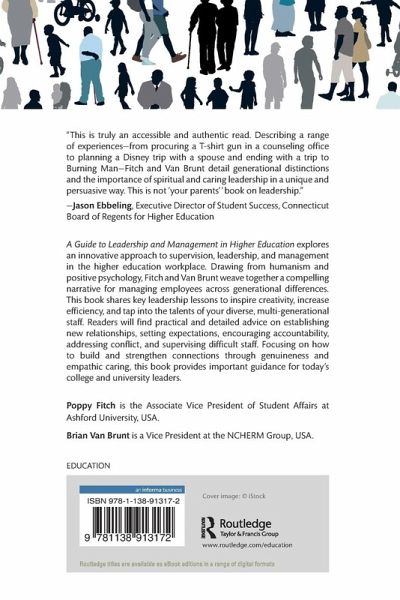 A Guide to Leadership and Management in Higher Education shares an innovative approach to supervision, leadership, and management in the higher education workplace. Drawing from humanism and positive psychology, Fitch and Van Brunt weave together a compelling narrative for managing employees across generational differences. This book shares key leadership lessons and advice on how to inspire creativity, increase efficiency, and tap into the talents of your diverse, multi-generational staff. This guide offers practical and detailed advice on establishing new relationships, setting expectations, encouraging accountability, addressing conflict, and supervising difficult staff. Focusing on how to build and strengthen connections through genuineness and empathic caring, this book provides important guidance for today's college and university leaders.