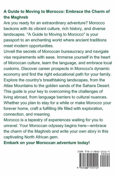 Are you ready to embark on an extraordinary adventure to the enchanting land of Morocco? "A Guide to Moving to Morocco: Embrace the Charm of the Maghreb" is your essential companion for this remarkable journey. Whether you dream of immersing yourself in the bustling medinas, exploring the mystical Sahara Desert, or savoring the flavors of Moroccan cuisine, this guide offers a comprehensive roadmap to make your move to Morocco a seamless and enriching experience. Morocco, with its vibrant culture, rich history, and diverse landscapes, beckons with open arms. Discover the intricacies of Moroccan life, from navigating the labyrinthine streets of ancient cities to embracing the warm hospitality of its people. Delve into the pages of this guide, and you'll find:Visa and Residency Insights: Unravel the intricacies of Moroccan bureaucracy, from visa requirements to residency permits, with practical tips to streamline your relocation. Cultural Immersion: Immerse yourself in the heart of Moroccan culture with guidance on language learning, etiquette, and understanding local traditions. Career Opportunities: Explore professional prospects in Morocco's growing economy and learn how to leverage your skills in this dynamic market. Family Life and Education: Discover resources for families, from international schools to healthcare options, ensuring a smooth transition for you and your loved ones. Travel and Exploration: Embark on adventures that span the country's diverse landscapes, from the Atlas Mountains to the Atlantic coast, and explore Morocco's hidden gems. Overcoming Challenges: Navigate the hurdles of living abroad, from language barriers to cultural differences, and turn them into stepping stones for personal growth. A Fulfilling Life: Whether you decide to stay temporarily or make Morocco your forever home, find tips for crafting a rewarding life filled with exploration, connection, and meaning. This guide is more than a mere handbook; it's your passport to the soul of Morocco. It's a celebration of the country's captivating allure and an indispensable resource for those ready to embrace the charm of the Maghreb. Whether you're an adventurer, an entrepreneur, or a family seeking a new beginning, "A Guide to Moving to Morocco" is your compass for navigating this extraordinary journey. Embark on your Moroccan odyssey today, and let the enchantment of this North African gem unfold before you.
