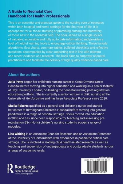 Julia Petty began her children's nursing career at Great Ormond Street Hospital before moving into higher education and working as a senior lecturer at City University, London leading the neonatal nursing post-registration education portfolio. She is currently a senior lecturer in child nursing at the University of Hertfordshire and has been Associate Professor since 2020. Lisa Whiting is a professional lead for children's nursing and an Associate Professor with experience in paediatric critical care settings. She is involved in the teaching and assessment of undergraduate and postgraduate students across a range of academic levels. Lisa has led several research projects that have spanned a range of child health issues and that have had a strong focus on the involvement and the voice of children, young people and their families. Sheila Roberts qualified as a general and children's nurse and started her career at Birmingham Children's Hospital before moving into general paediatrics in a range of hospital settings. Sheila moved into education in 2006 and has since been responsible for teaching and assessing pre-registration BSc (Hons) children's nursing students across a range of modules.