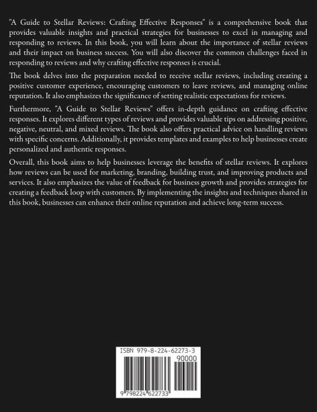 "A Guide to Stellar Reviews: Crafting Effective Responses" is a comprehensive book that provides valuable insights and practical strategies for businesses to excel in managing and responding to reviews. In this book, you will learn about the importance of stellar reviews and their impact on business success. You will also discover the common challenges faced in responding to reviews and why crafting effective responses is crucial. The book delves into the preparation needed to receive stellar reviews, including creating a positive customer experience, encouraging customers to leave reviews, and managing online reputation. It also emphasizes the significance of setting realistic expectations for reviews. Furthermore, "A Guide to Stellar Reviews" offers in-depth guidance on crafting effective responses. It explores different types of reviews and provides valuable tips on addressing positive, negative, neutral, and mixed reviews. The book also offers practical advice on handling reviews with specific concerns. Additionally, it provides templates and examples to help businesses create personalized and authentic responses. Overall, this book aims to help businesses leverage the benefits of stellar reviews. It explores how reviews can be used for marketing, branding, building trust, and improving products and services. It also emphasizes the value of feedback for business growth and provides strategies for creating a feedback loop with customers. By implementing the insights and techniques shared in this book, businesses can enhance their online reputation and achieve long-term success.
