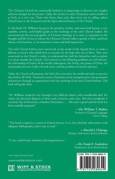 The Christian Church has continually looked to its beginnings to discover new insights and new strength for the present. Today the interest in early Christianity and its leaders is as lively as it ever was. Those who know these early days never tire in calling today's Church back to the Scriptures and the Spirit directed history of the Church. In this book, Dr. Williams has given the preacher, teacher, and concerned layman a very readable, concise, and helpful guide to the teachings of the early Church leaders. He communicates the exciting quality of Christian theology as it came to expression in the thought and life of men to whom the Christian Church today is greatly in debt, and from whom, with humility, it can continue to learn and find inspirations. The early Church Fathers were concerned, in the words of the Apostle Peter, to make a defense to anyone who called them to account for the hope that was in them. They were concerned, as the Church is today, to understand the faith for themselves and to explain it to those outside the Church. Their answers to the following problems are still relevant: the relationship of God to all the world, redemption, the Trinity, the person of Christ, the relationship between God's will and man's, and the problem of church and state. Today the Church still possesses the faith that overcomes the world and seeks to practice that faith in all of life. Twentieth century Christians can be strengthened in that possession and practice through an acquaintance with the teachings of the early Church Fathers. This book will guide them.