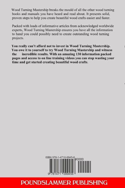 Wood Turning Mastership breaks the mould of all the other wood turning books and manuals you have heard and read about. It presents solid, proven steps to help you create beautiful wood crafts easier and faster. Packed with loads of informative articles from acknowledged worldwide experts, Wood Turning Mastership ensures you have all the information to hand you could possibly need to create outstanding wood turning projects. You really can't afford not to invest in Wood Turning Mastership. You owe it to yourself to try Wood Turning Mastership and witness the incredible results. With an amazing 130 information packed pages and access to on line training videos you can stop wasting your time and get started creating beautiful wood crafts.