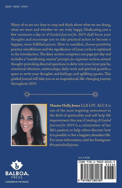 Many of us are too busy to stop and think about what we are doing, what we want and whether we are truly happy. Dedicating just a few moments a day to A Guided Journal for 2019 shall focus your thoughts and encourage you to take practical action to become a happier, more fulfilled person. How to manifest, choose positivity, practice mindfulness and the significance of lunar cycles is explained in the introduction. The diary section comprises one page per day and includes a manifesting mantra prompt; an organiser section; several thought-provoking directed questions to delve into your inner psyche, emotional vibration, relationships, daily work and spiritual growth; a space to write your thoughts and feelings; and uplifting quotes. This guided journal will take you on an inspirational, life-changing journey throughout 2019.