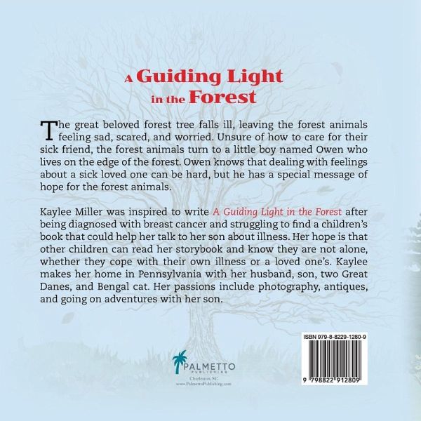 When a beloved tree falls ill, the forest creatures feel sad and afraid. Unsure of what to do, they ask a little boy named Owen for help and learn about the special guiding light they each have inside themselves. The great forest tree is sick. Its leaves have wilted, and its branches are weak. The forest creatures that have loved the tree and called it home are worried. They have never cared for a sick friend before. Luckily, little Owen lives near the forest, and he knows what can help both the tree and the forest creatures find joy and comfort during this difficult time. Lovingly crafted to help children understand and cope with their emotions when a loved one is sick, A Guiding Light in the Forest is the perfect storybook for families to read and discuss together. The book encourages kids to open up about the difficult feelings they may be experiencing and provides guidance on how they can respond to their sick loved one. A Guiding Light in the Forest can also help a child who may be coping with their own illness. With beautiful illustrations and a simple narrative, this storybook is ideal for children ages 4 to 9. Parents who want to engage their kids in honest discussion about emotional wellbeing and how to access hope in difficult situations will enjoy the book's honest and positive outlook. A Guiding Light in the Forest can help families find their own special inner strength as they become caregivers.